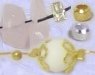monachelle dorate, chiodi con gancio, anellini oppure calotte coprinodo, pive a torciglione, rocailles interno argentato, bobina di filo d'ottone oppure di rame, perle sfaccettate Marianne Hobby 4 e 6 mm. Wedding favour: nastrino di raso bomboniere e tulle bomboniere per confetti.